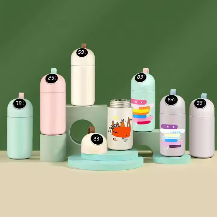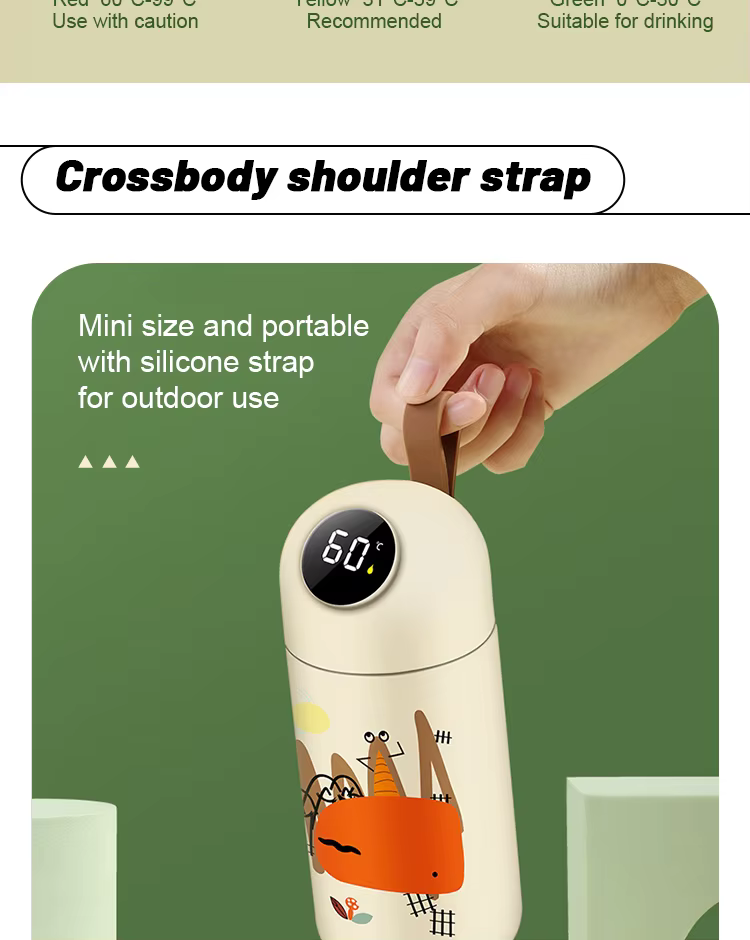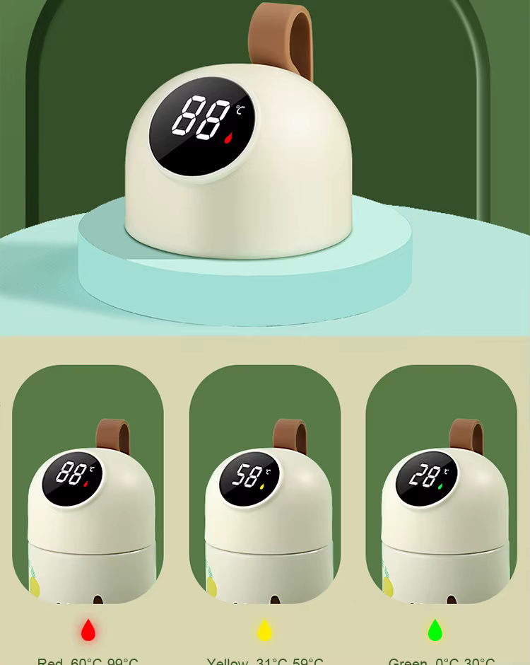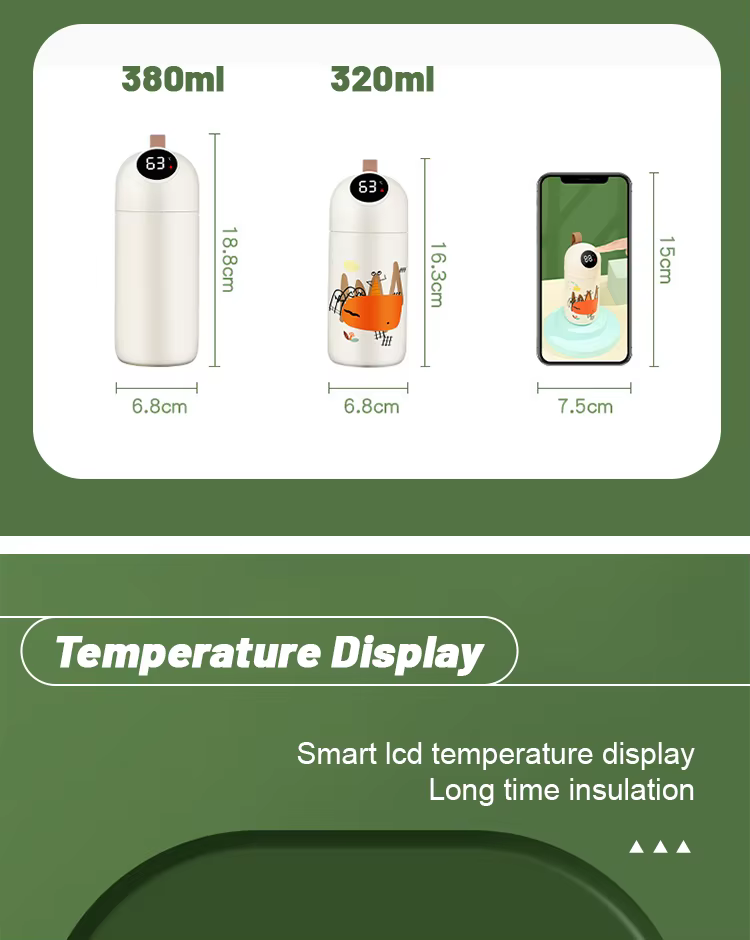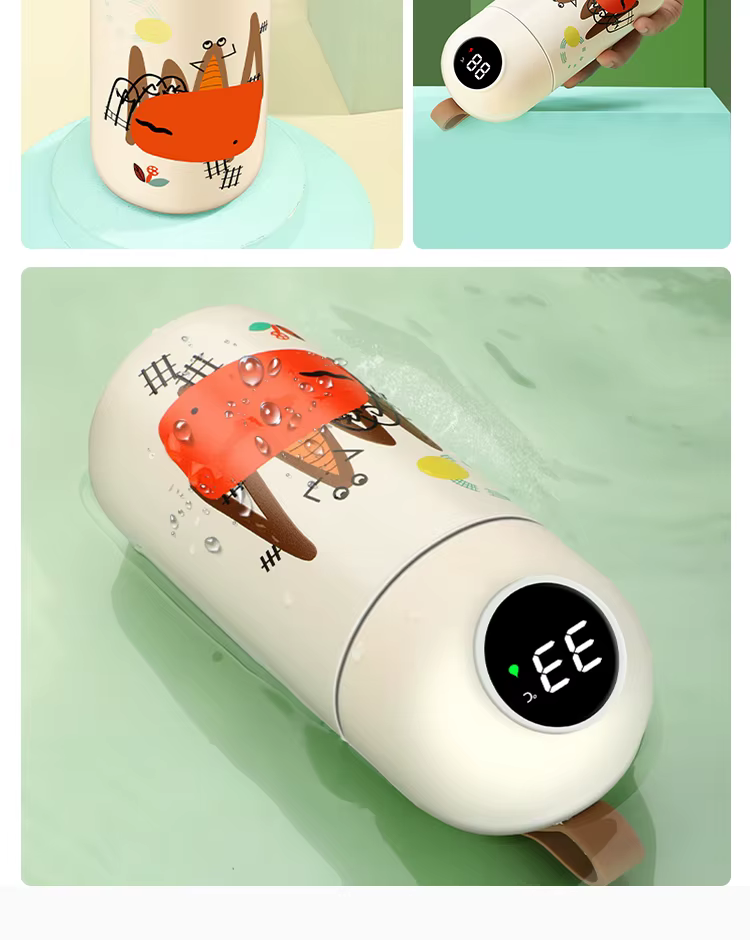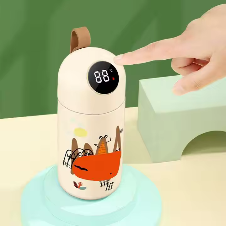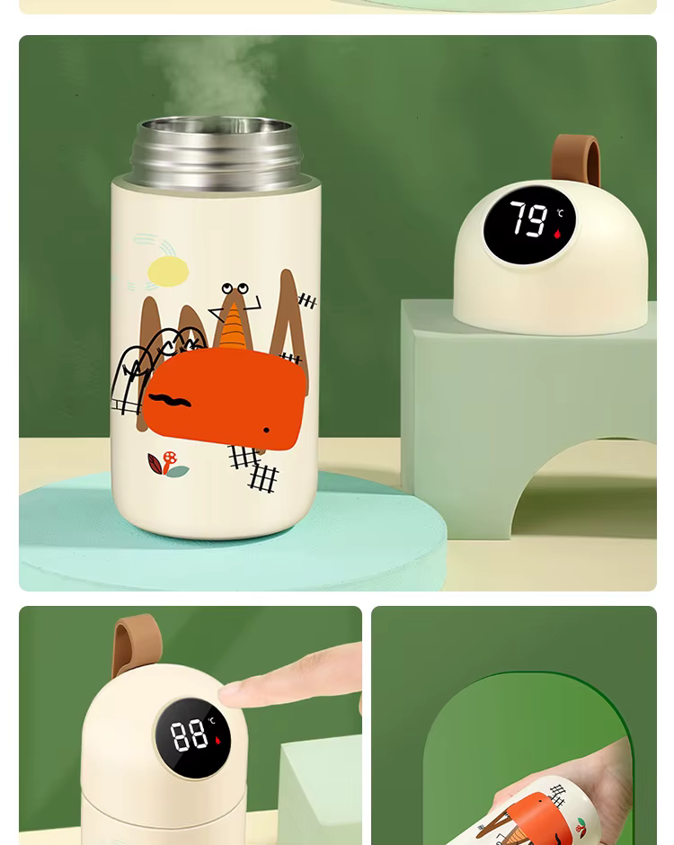 Этот умный детский термос с мультяшным дизайном и встроенным дисплеем создан для заботливых родителей! Благодаря датчику температуры на крышке вы всегда знаете, насколько горячий или холодный напиток внутри. Два объёма – 320 мл и 380 мл, силиконовый ремешок для удобства и 8 стильных расцветок. Термос долго сохраняет температуру и легко заряжается через USB.